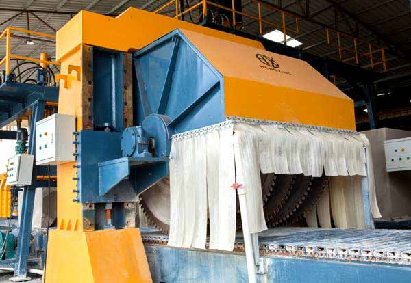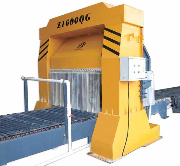脱模好的坯体通过分块式切割机进行分块切割,将整块毛坯(2.8立方)分割成三块适合成品流水线切割机的切割尺寸。然后毛坯翻转吊具将分块切割好的坯体进行横向旋转,吊运到成品切割区进行成品切割。首先是通过Z1600QZ流水线切割机,进行第一次成品切割,Z1600QZ流水线切割机是采用金刚石刀头,德国进口钢片制成的刀片精致而成经久耐用。进行完第一次流水线切割后,通过90翻转机对坯体进行水平方向90度旋转,改变切割方向。再通过扳倒机对改变过方向的坯体进行翻倒,然后输送给Z800QG切割机,进行第二次成品切割。
